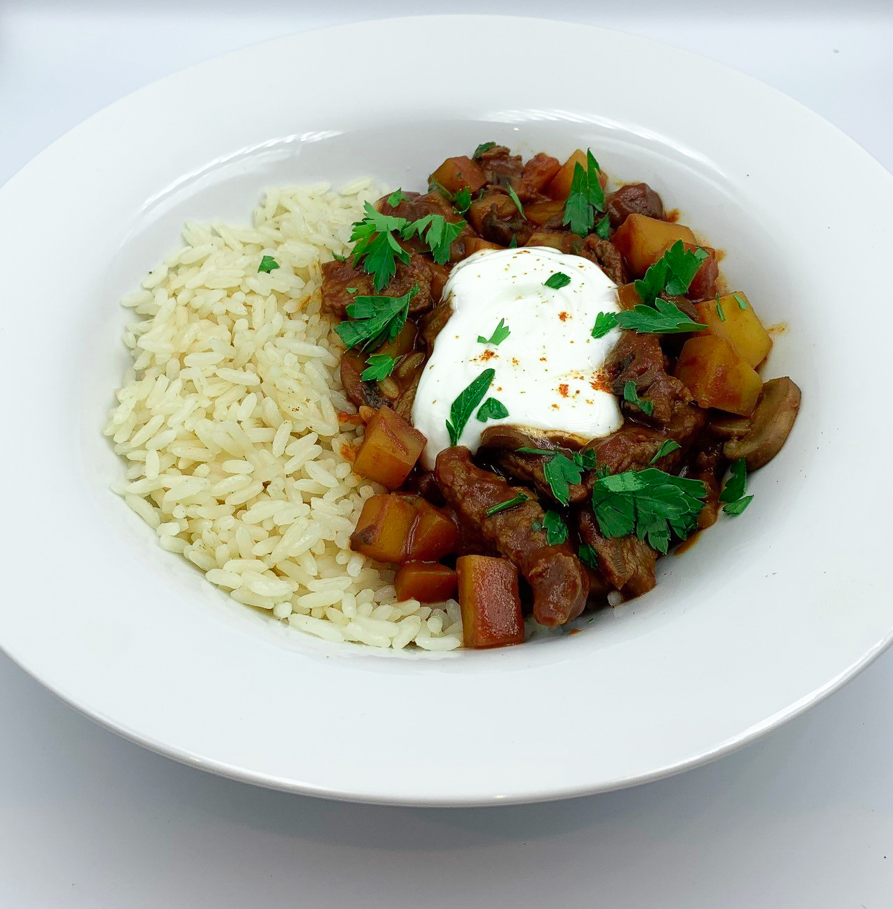 - Serve the goulash with a mixed green salad. Alternatively, with brown rice, whole wheat pasta or cheese scones (known as pogácsa in Hungary).