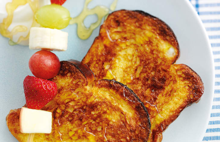 - Meanwhile, thread alternative pieces of fruit of your choice onto 2 wooden skewers or 4 cocktail sticks and place on top of the eggy bread.