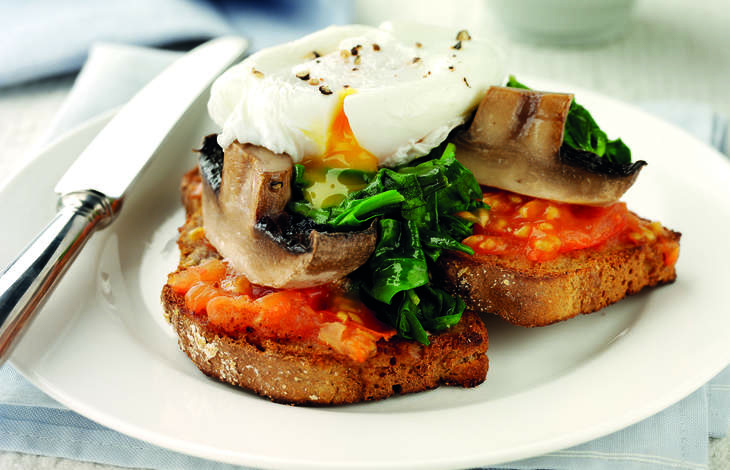 - Squash 1 tomato half into each slice of toasted bread. Then sandwich the mushroom and spinach together and place on top of the tomato toast. Top with the softly poached eggs and serve with an extra roast tomato.