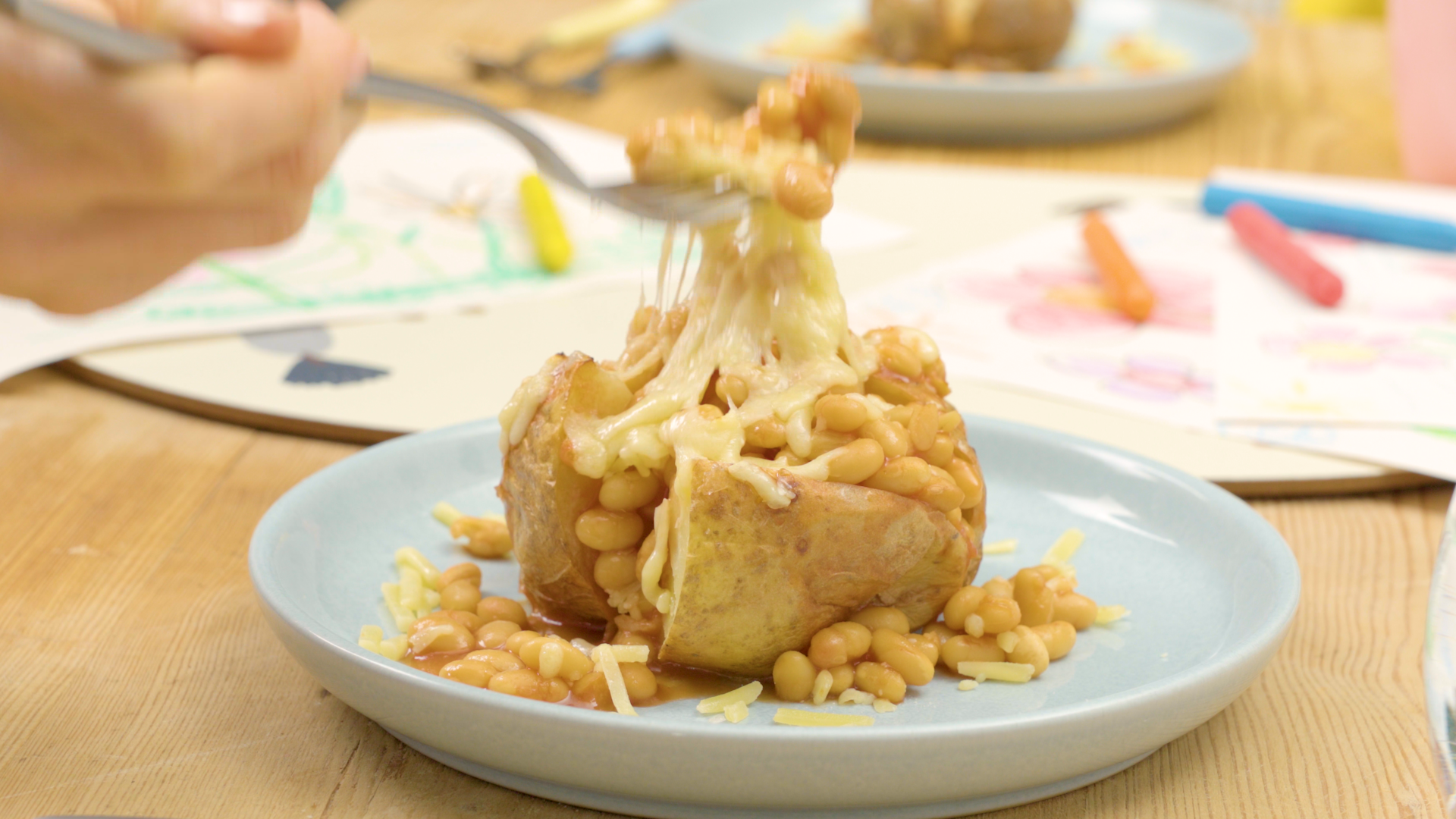 - While the potatoes are cooking, open the baked beans and gently heat them in a saucepan.