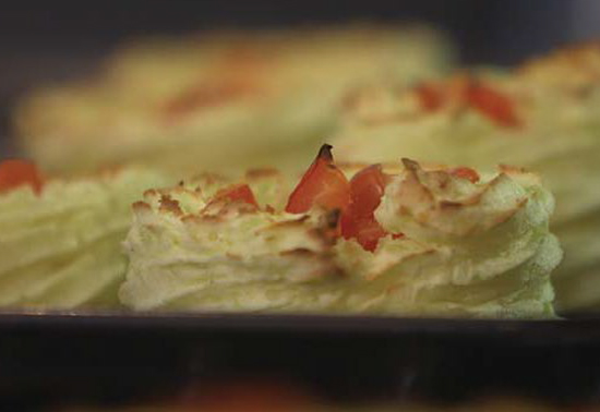 - Make sure the potato has cooled enough for you to hold in your hand, half fill a disposable piping bag with the warm mash. Here’s where the fun starts! Pipe your potato nests onto a non-stick baking tray, they want to be about 8 cm in diameter and about 3 – 4 cm high (the size of a meringue nest)