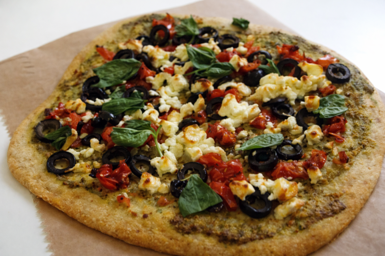9. Arrange the tomato and olives on top of the pizza.