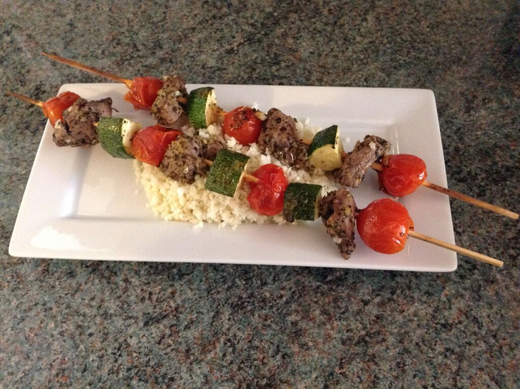 8. Thread the lamb, pepper, courgette and cherry tomatoes onto 4 short or 2 long wooden (previously soaked) or metal skewers.