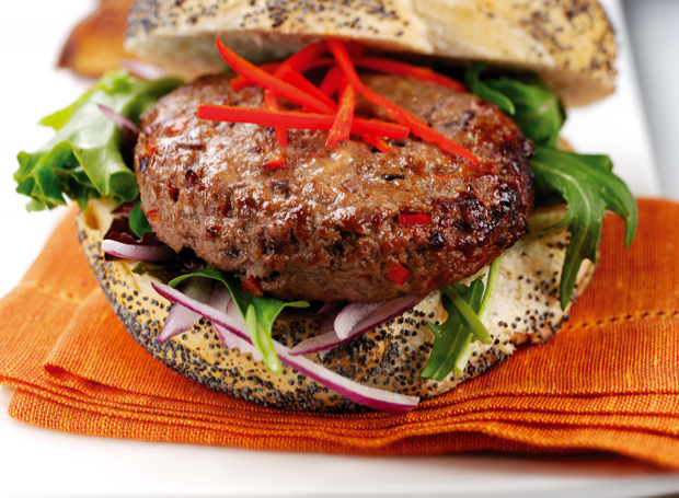 - Serve the burgers in rolls garnished with salad leaves, finely shredded chilli strips and a spoonful of your favourite prepared relishes and potato wedges.