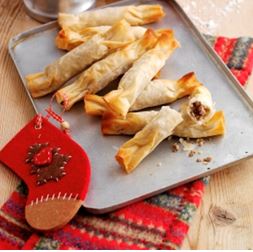 10. Roll the filo pastry into a sausage shape and pinch the pastry at each end to create the frilly ends of the cracker.
