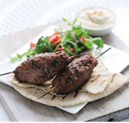 - Serve the skewers on top of grilled Mediterranean flat bread, a side salad and a dollop of hummus.